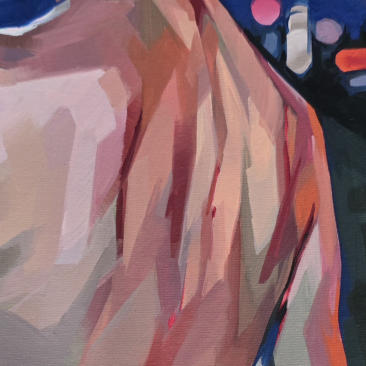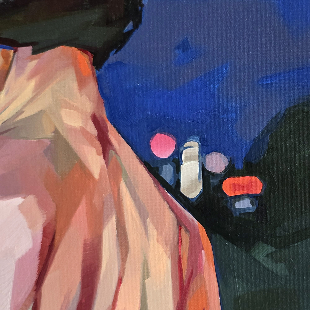 What interested me was the tension: harsh light on soft skin, artificial colors over an intimate gesture.