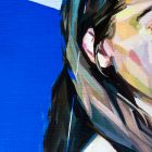 The blue background has lately been a constant in my works. Its vibration and purity captivate me. The simple geometric backgrounds I use are meant to stabilize and balance the composition of the work, making it as stable as possible as a whole.