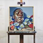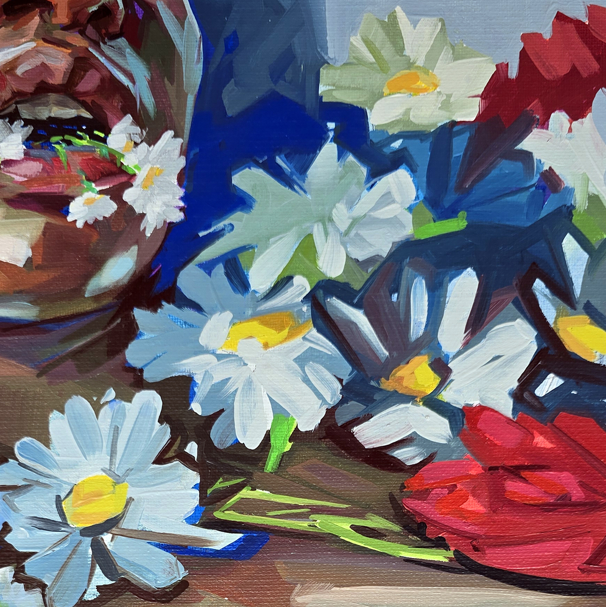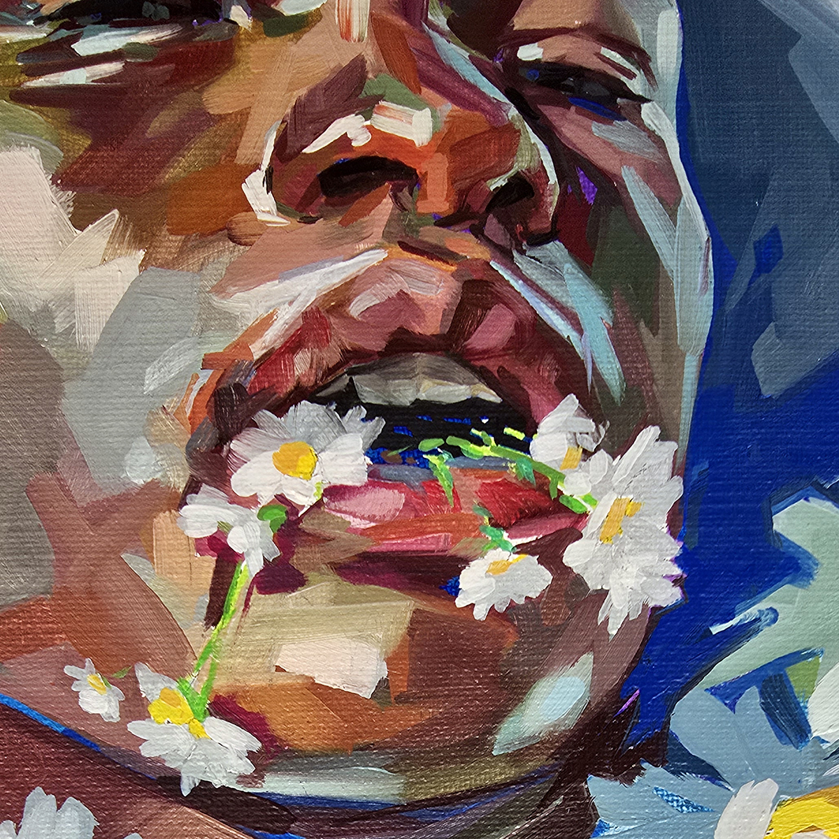 Cool background tones push toward the warmth of the skin, while the petals —white, red, and blue— slowly merge with it.